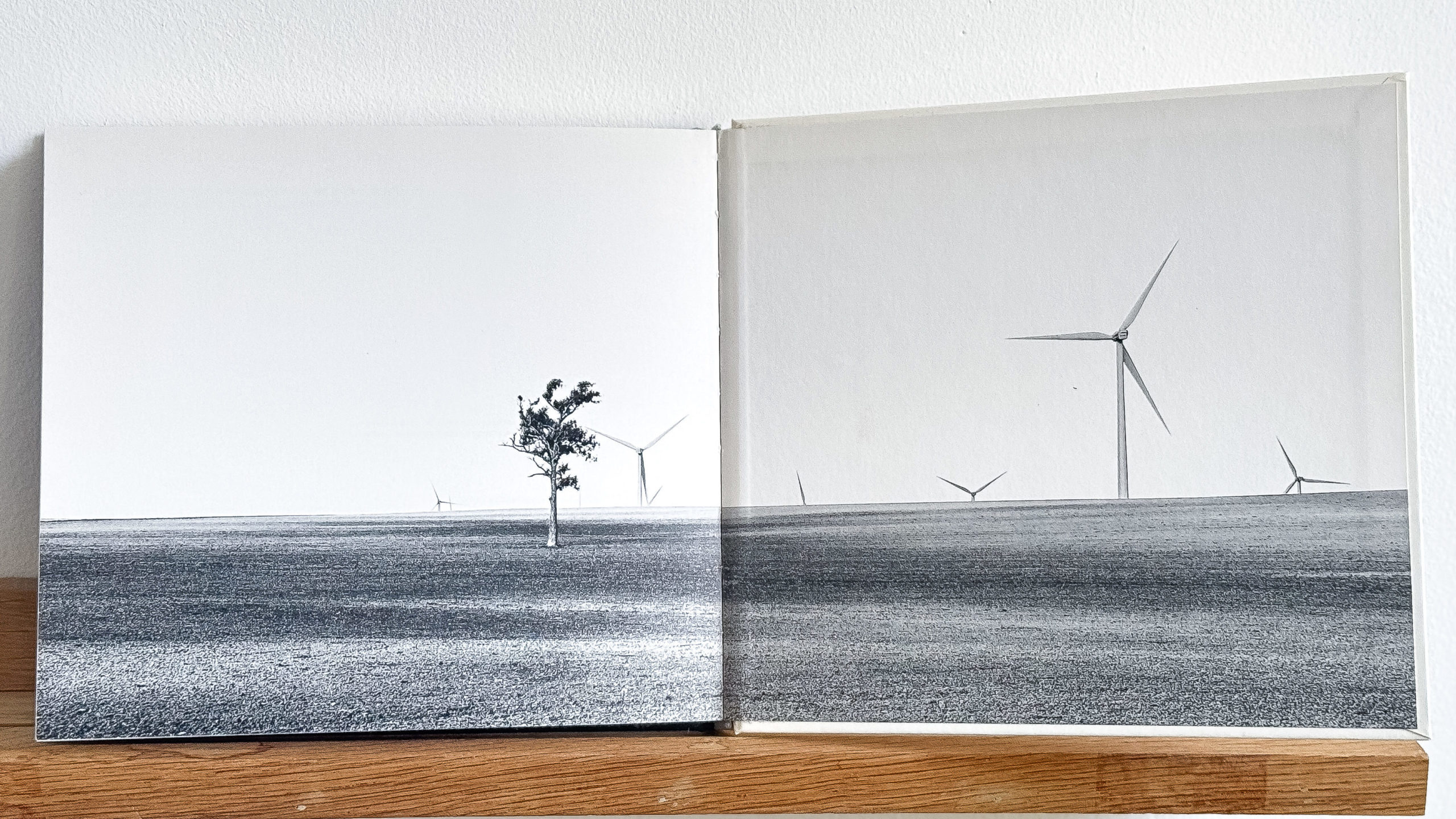 Ratiboisés par l’abominable tendance humaine à la discipline, des platanes bordent les chemins, reprenant malgré la tronçonneuse leur élan vers la lumière et la liberté. Les beaux arrangements des haies se voient bousculés par un peuplier rebelle, ou plus sensible aux vents : il penche, il penche, telle une tour de Pise végétale, désordonnant le rang. Sur la page de garde finale, un paysage minéral, plat comme la mort, où les pales des éoliennes semblent découper l’espace, telles des lames de faucheuse. Un arbre seul anime la scène, de son indomptable désordre organique.